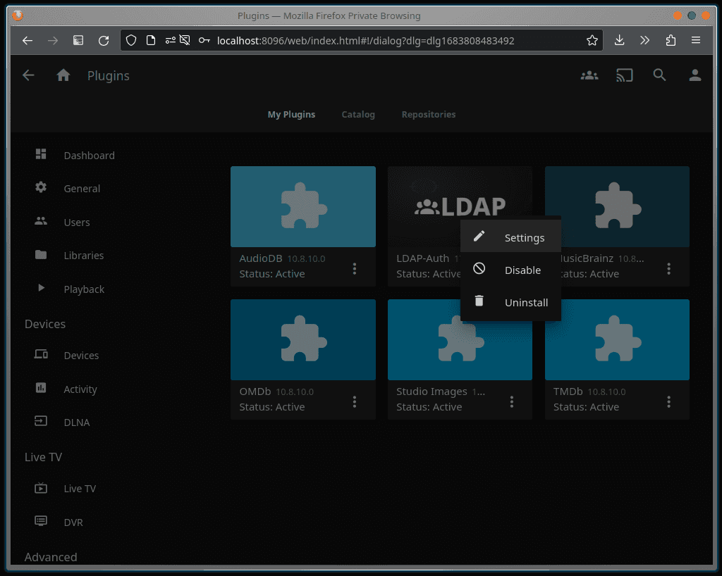 Then from My Plugins click on the three dots for the LDAP-Auth plugin and click Settings.