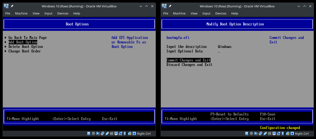 Boot Maintenance Manager > Boot Options > Add Boot OptionEFI/Microsoft/Boot/bootmgfw.efiWindows), before selecting Commit Changes and Exit.Then: