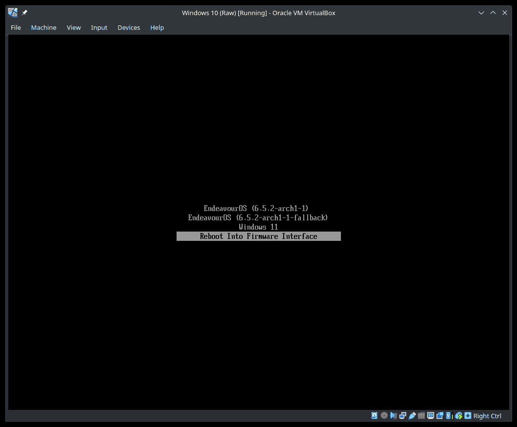 VirtualBox Manager, press New.Windows 10 (Raw)).Base Memory and Processors. Tick Enable EFI (special OSes only).Use an Existing Virtual Hard Disk File, and select the .vmdk file you created earlier before pressing Finish.We are now ready to Start our new virtual machine. Let's reorder our boot menu so that our virtual machine always boots into the correct OS.
