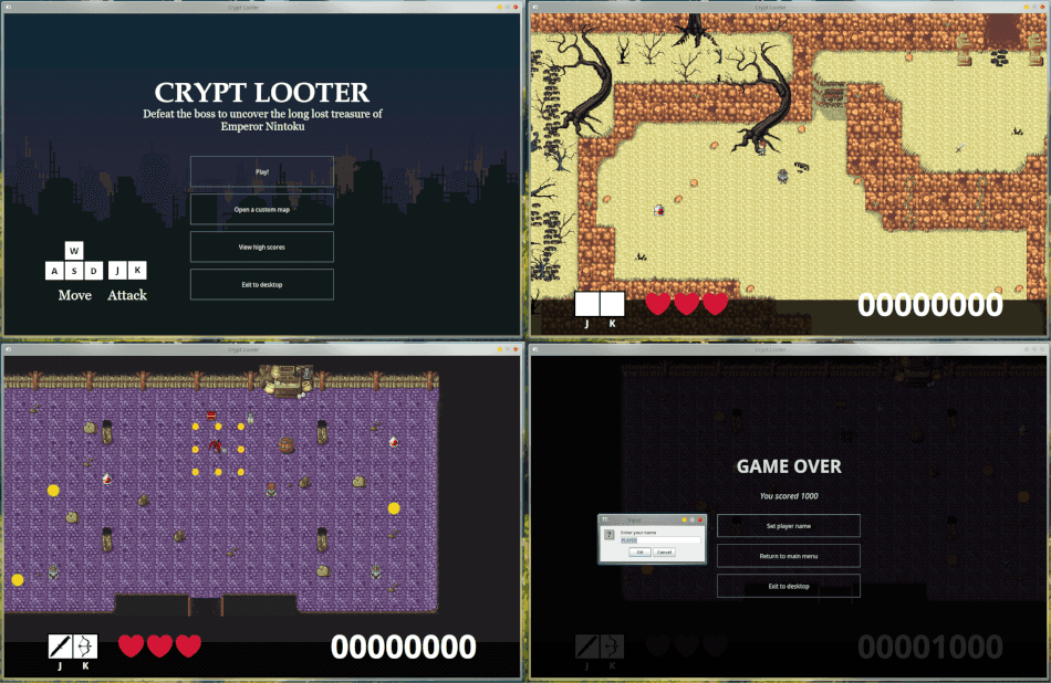 - A number of enemies including a skeleton that performs melee attack and a boss that fires projectiles out in eight-directions from itself. These enemies start chasing after the playing when in the near vicinity. The player experiences damage when hit by their attacks (also visually demonstrated by a red flash).